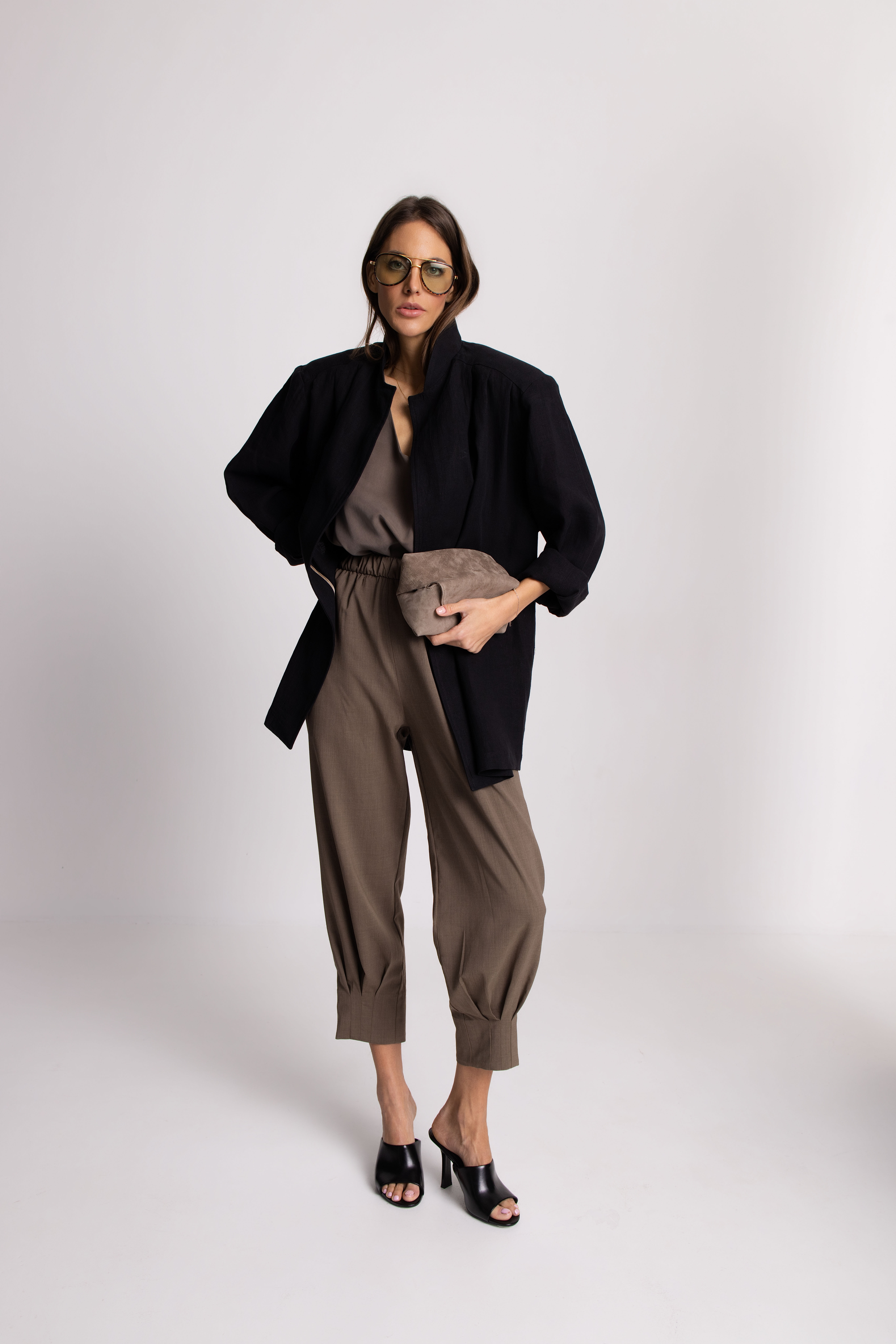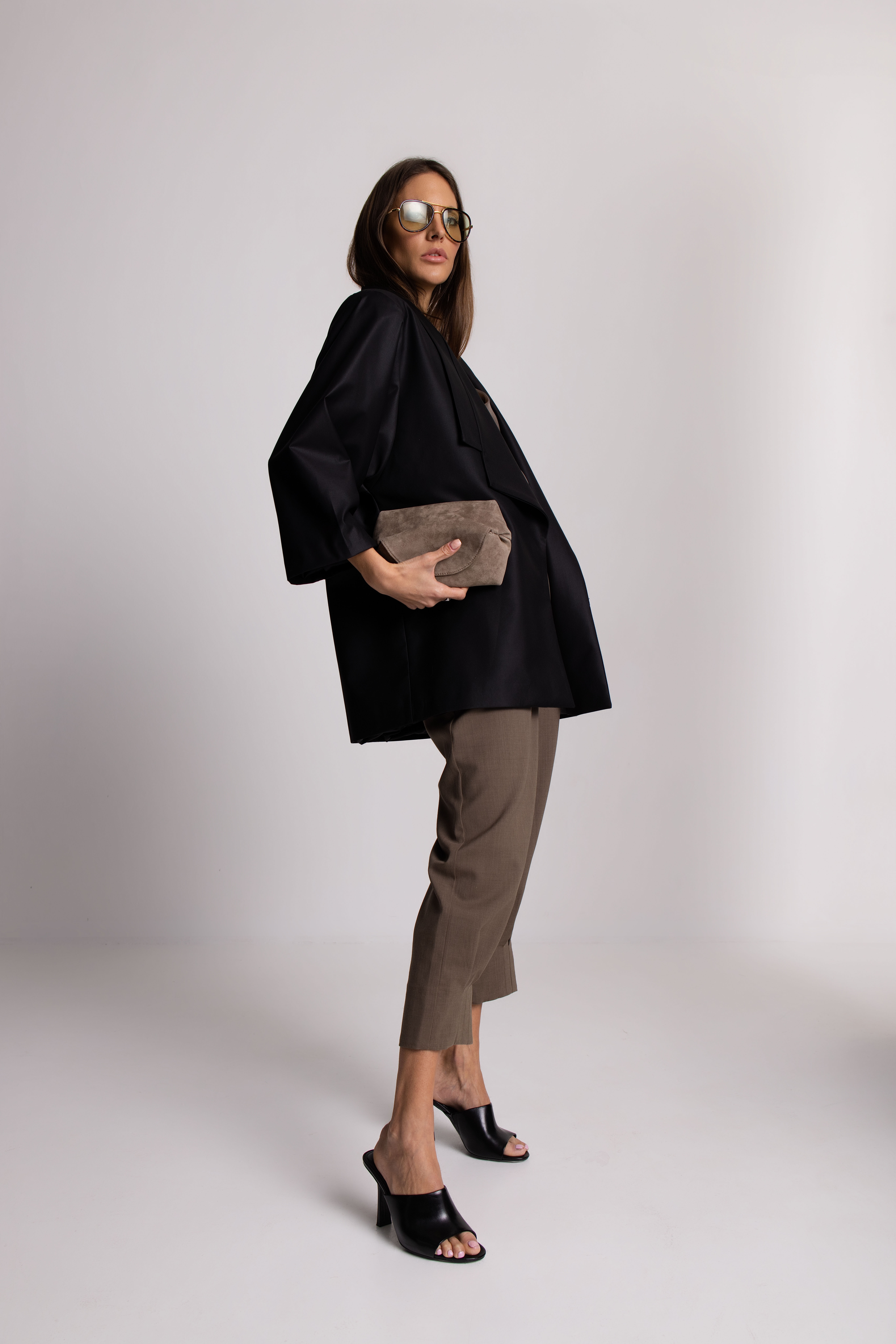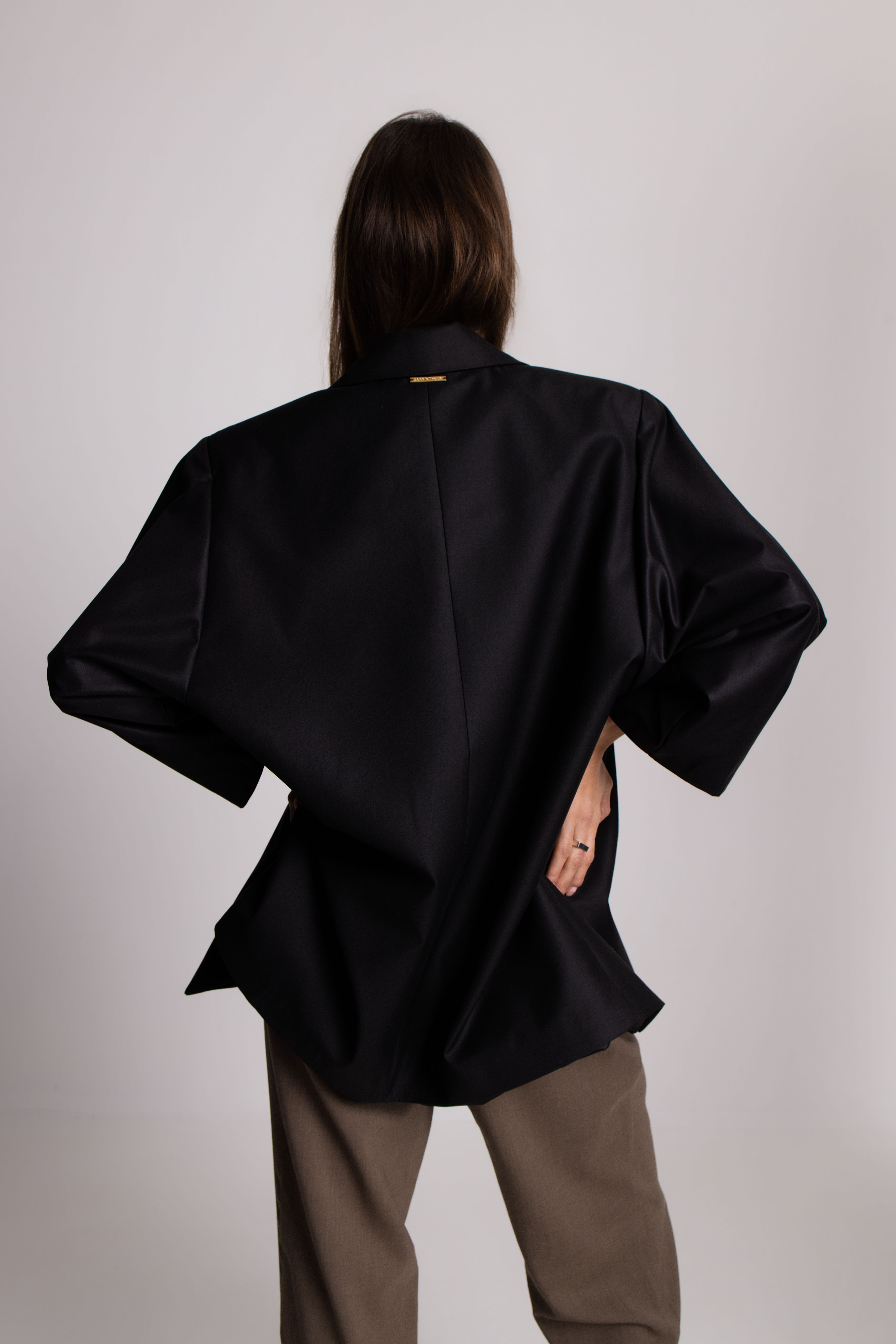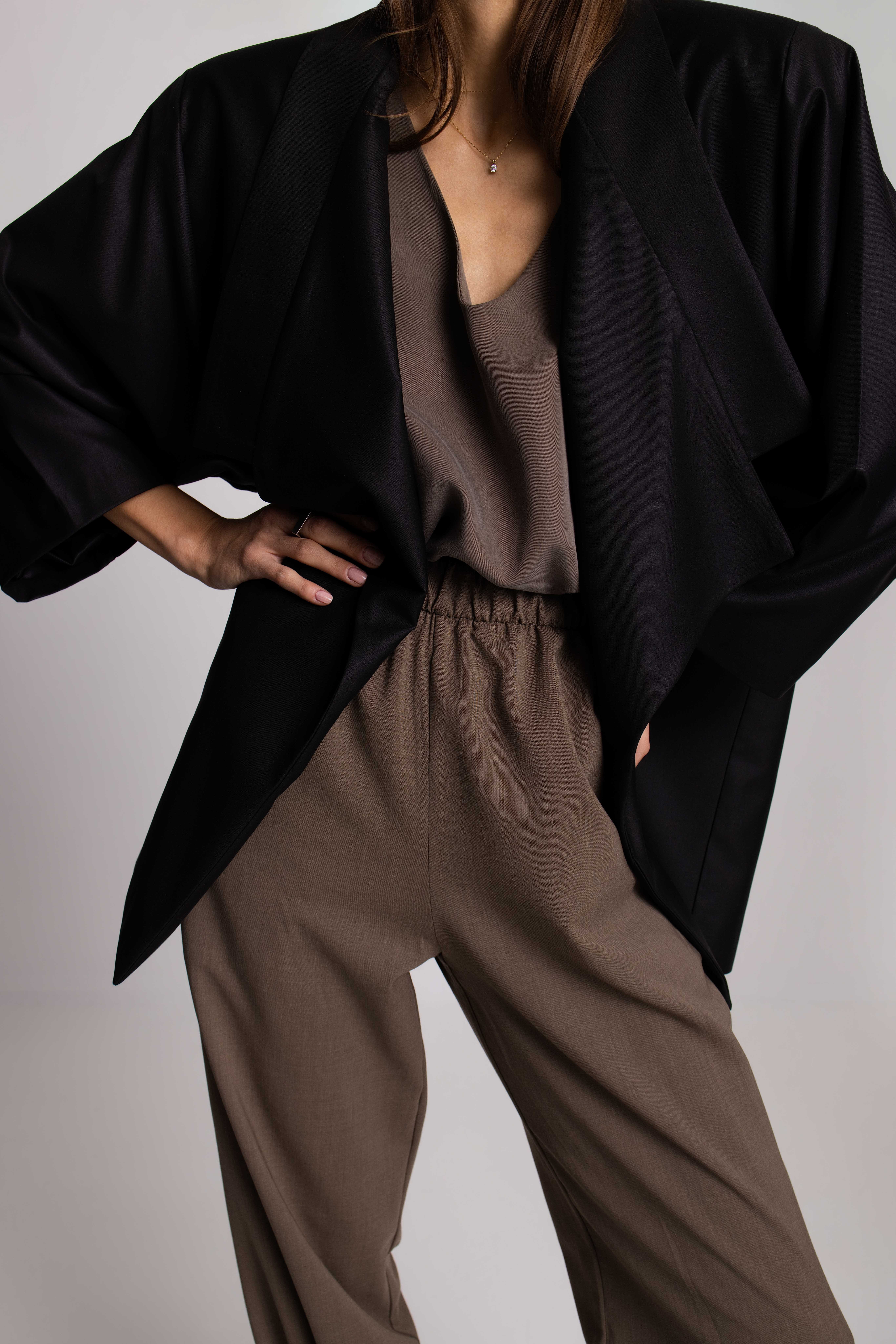 This suit is handcrafted from a carefully selected blend of cotton and elastin, that gives comfort and a perfect fit. The mix of natural materials and refined tailoring offers lightness, breathability, and elegance, while artisanal craftsmanship ensures exceptional attention to detail and lasting quality. The jacket’s distinctive collar and lapels can be worn open for an elegant, nonchalant vibe, or closed with a belt to create a kimono-style dress, adding a unique, minimalist twist inspired by Japanese design. It is perfect for the day at the office, casual weekends, fall evenings out, and business trips.