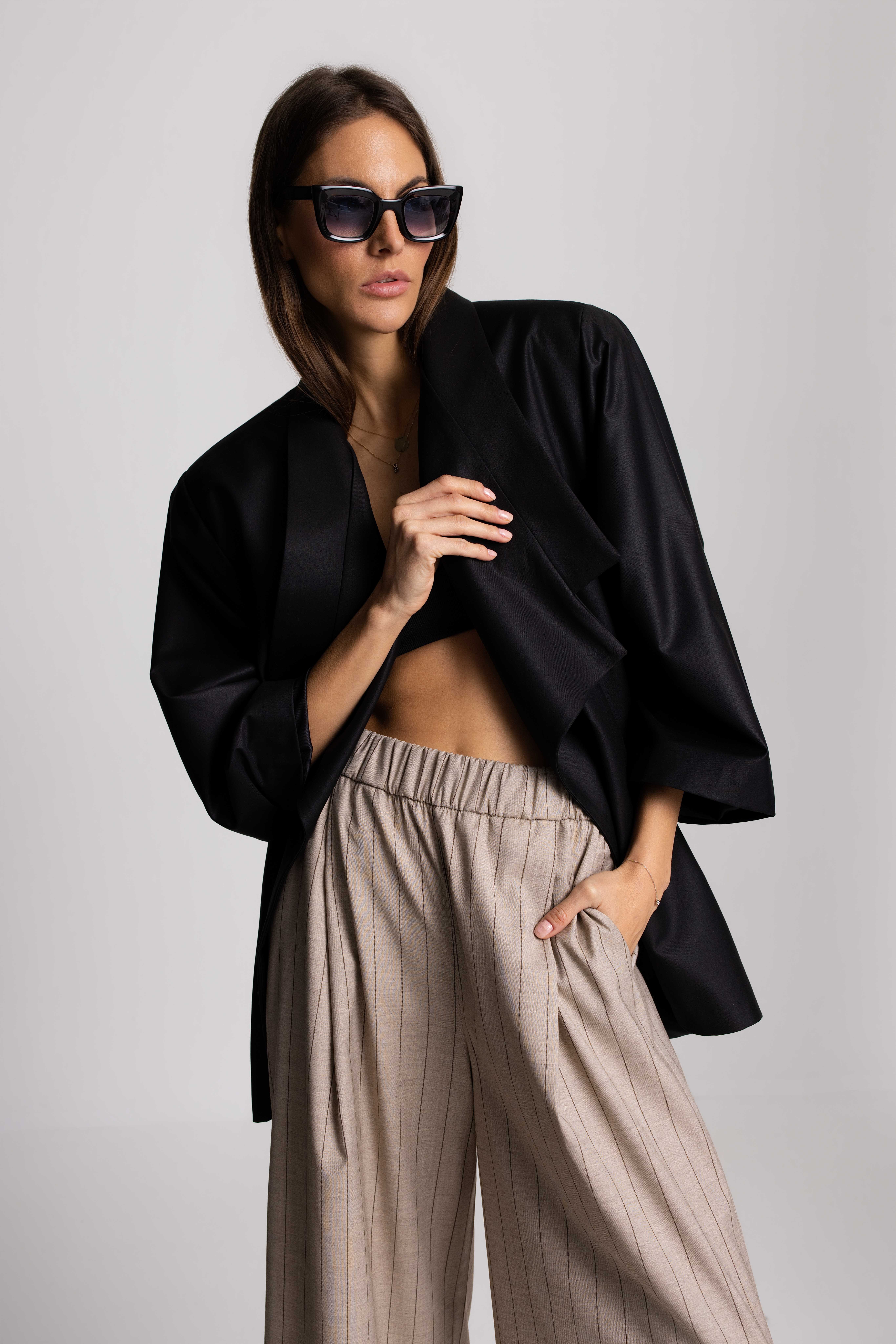 The shorter cut gives the piece a fresh, fashion-forward feel, while the wide-leg shape allows for natural movement and comfort. Minimal yet distinctive, these trousers are perfect for styling with sleek tops, oversized shirts, or structured jackets.