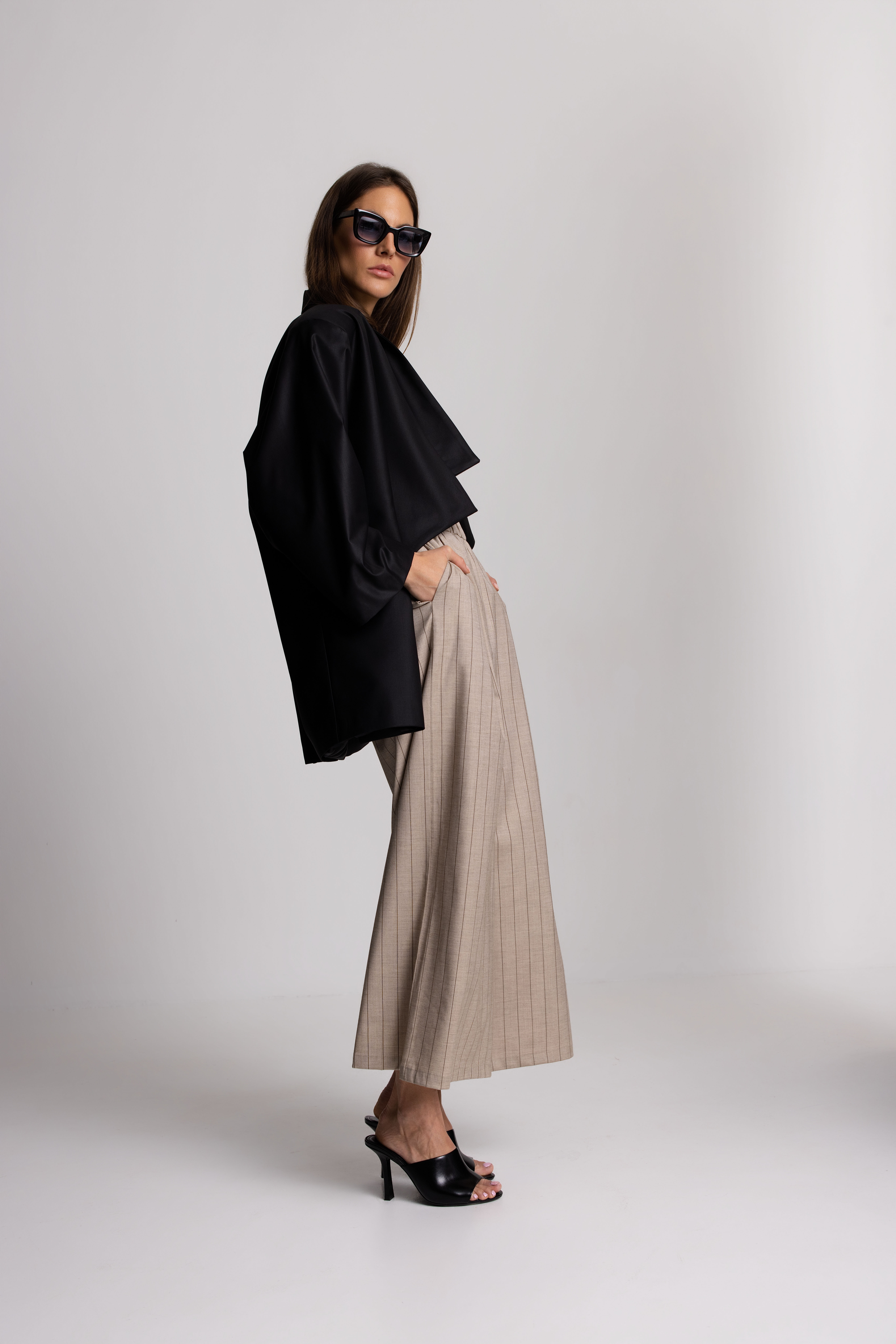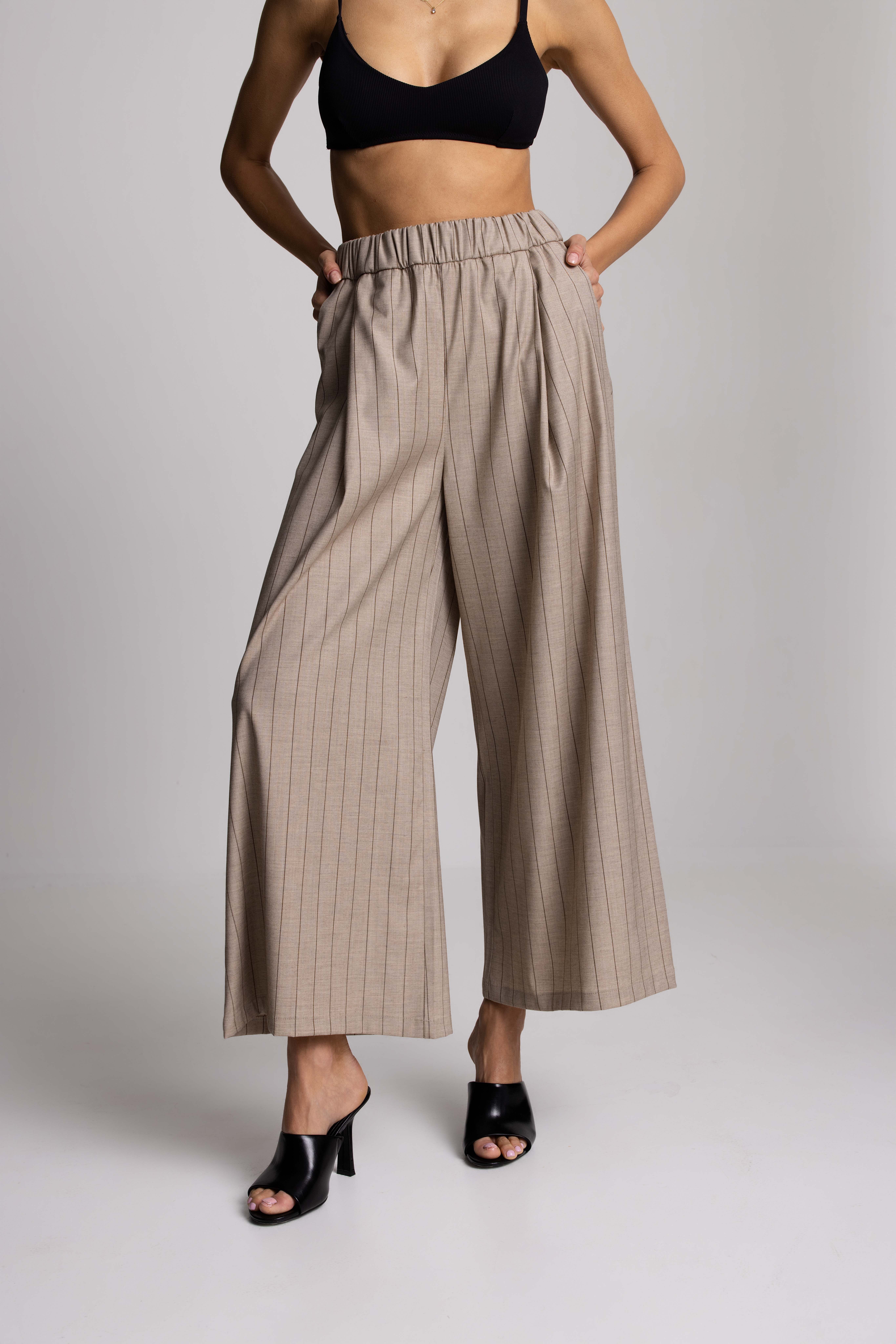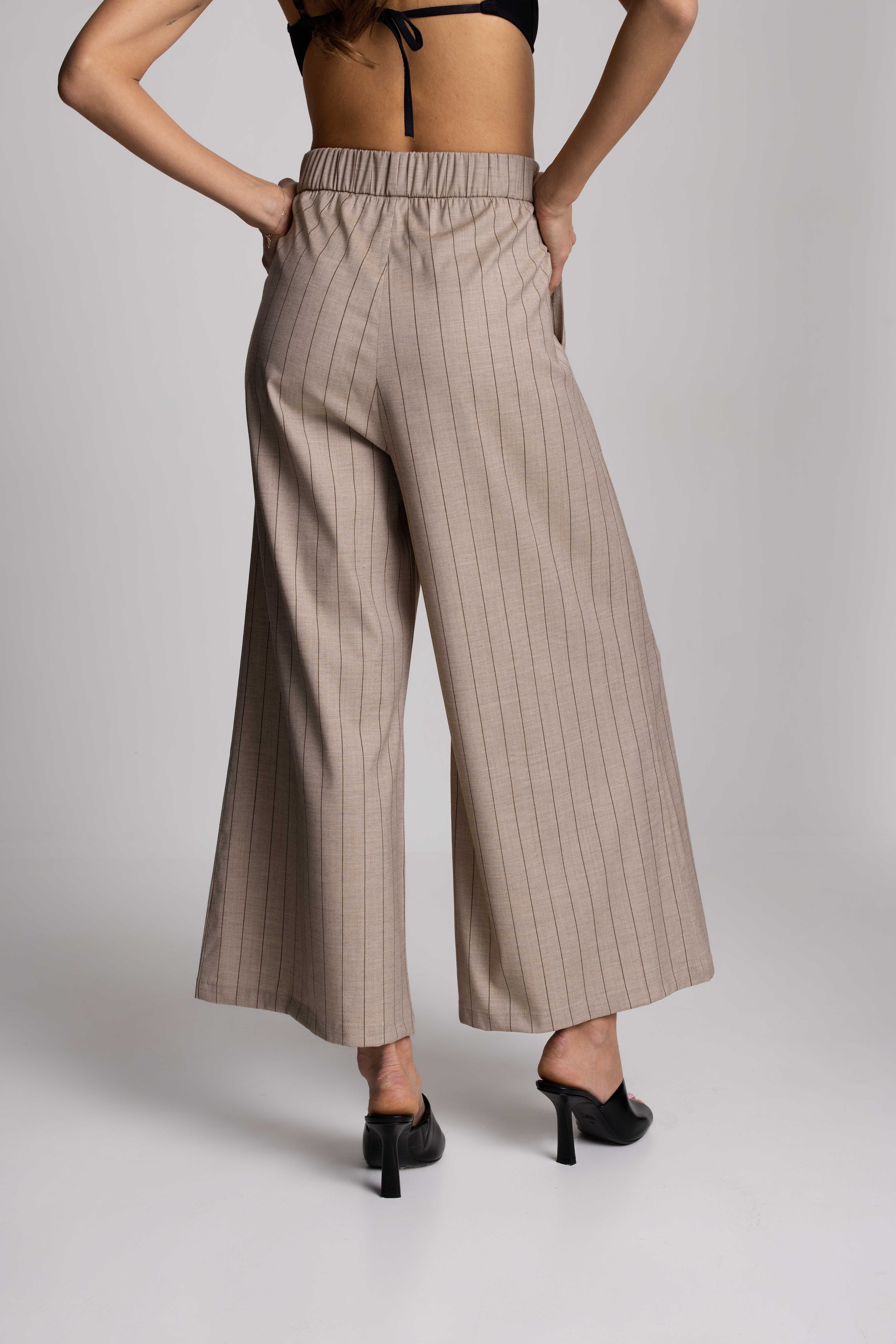 Relaxed tailoring with a modern edge. These beige sand trousers are designed with a cropped length and a wide, flowing leg that creates an effortless, contemporary silhouette. The soft neutral tone is elevated by sharp black stripes, adding contrast and a refined graphic element to the design.