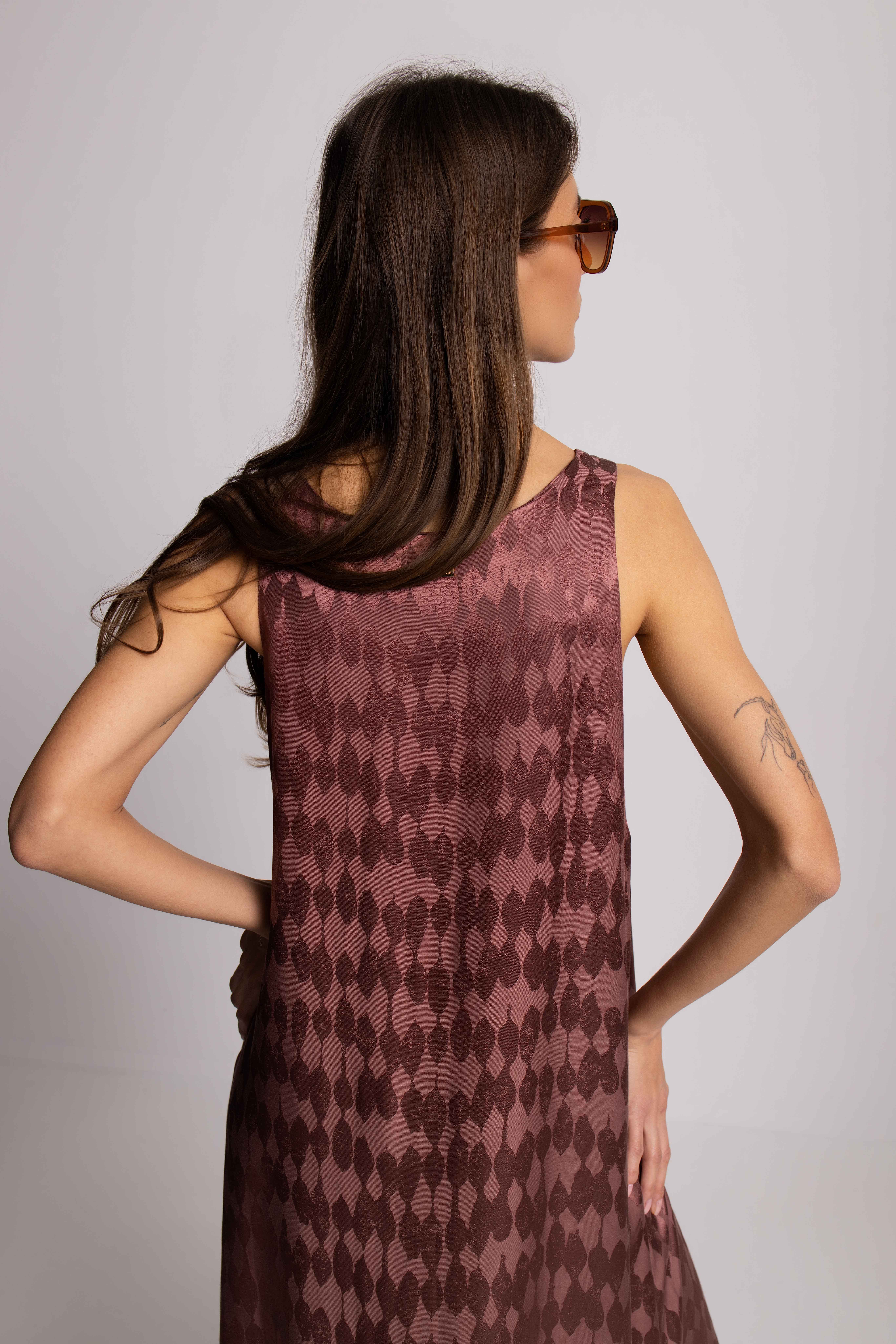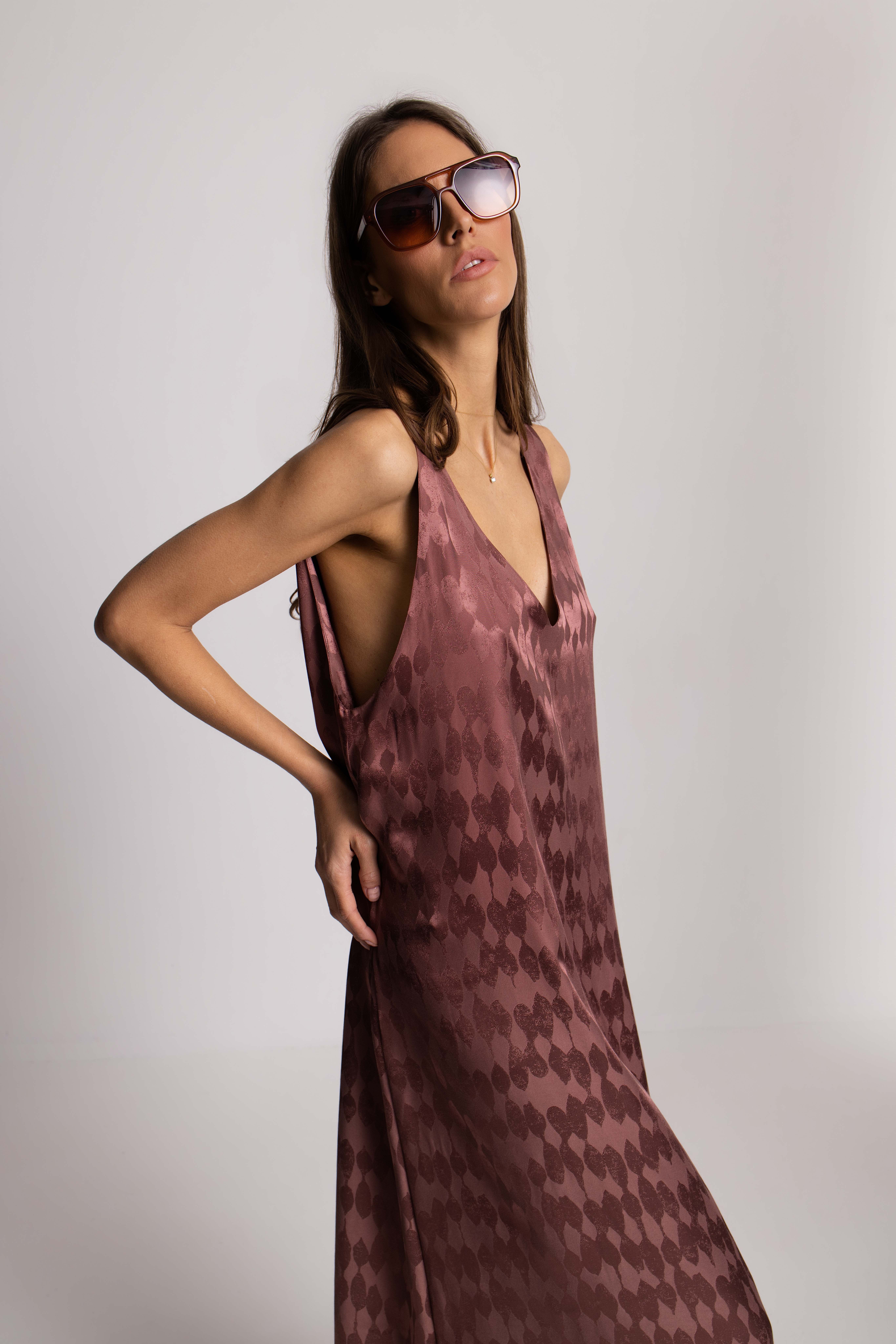 The Real Women Dress in burgundy is designed for effortless elegance and quiet confidence. Cut in a fluid, elongated silhouette, it softly follows the natural lines of the body, creating a look that feels both relaxed and refined. The delicate pearl-toned fabric catches the light with every step, giving the dress a subtle glow without ever feeling overdone. Its minimalist shape, thin straps, and deep neckline bring a sense of modern femininity — simple, sensual, and unapologetically real. From slow mornings to long evenings, it’s made to celebrate real bodies, real movement, and real moments.