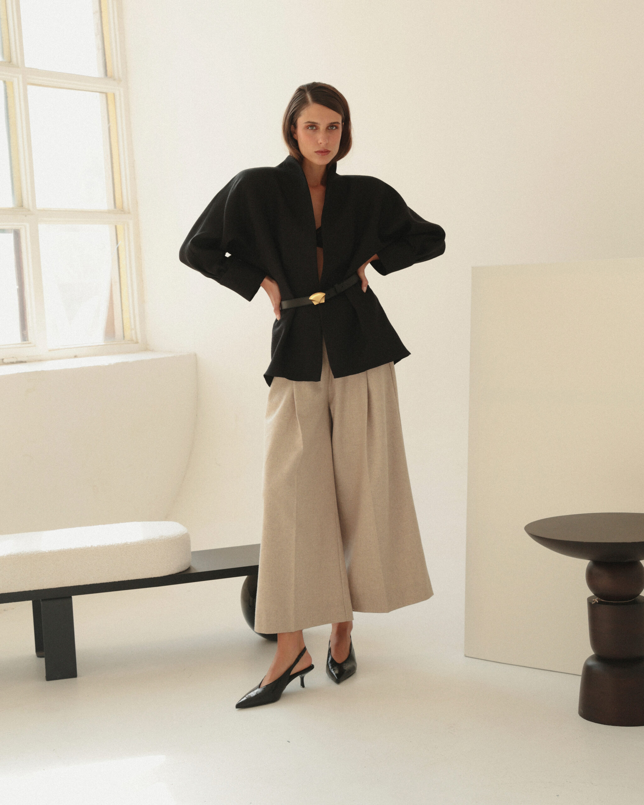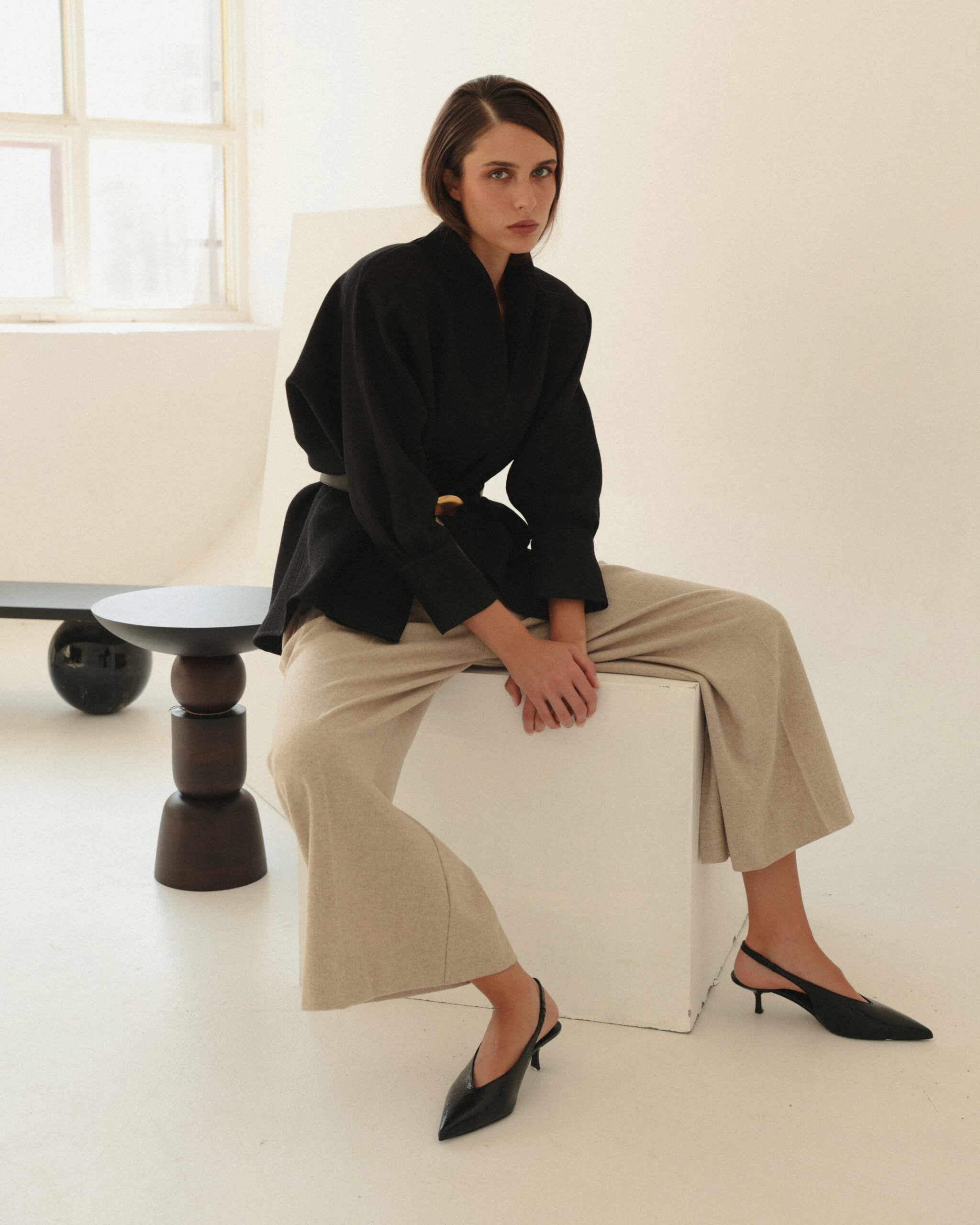 A minimalist wool jacket combining clean lines with effortless elegance.
